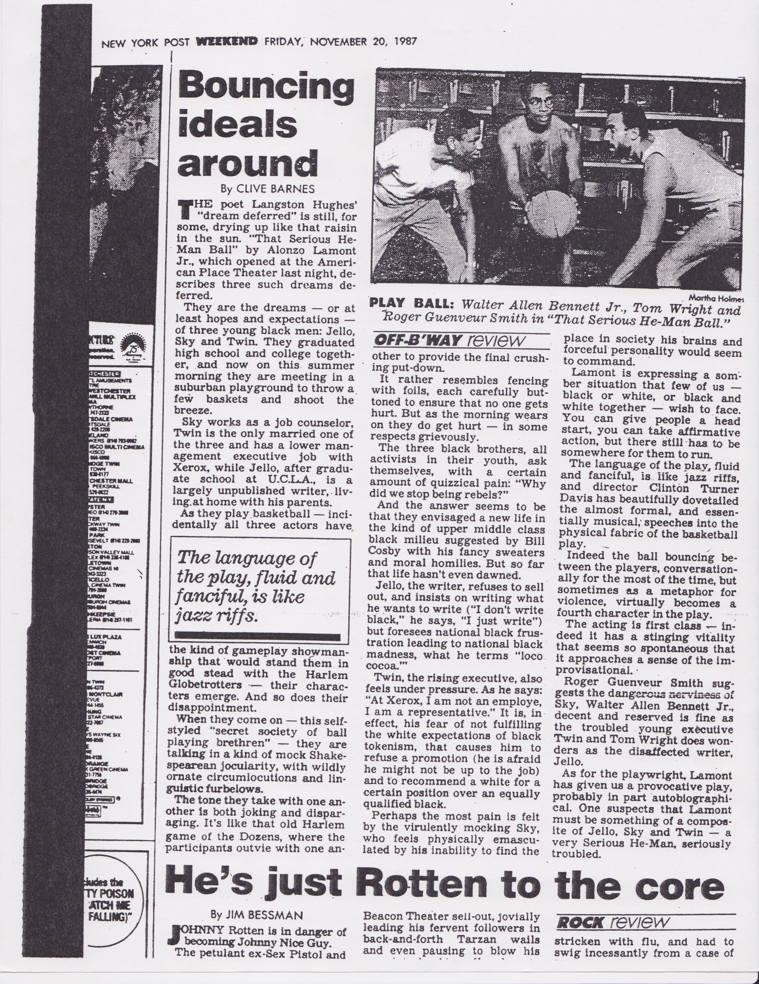 One morning back in the late 80’s I woke up to a ringing phone and it was my friend Roger Guenveur Smith. Roger told me to buy a copy of the New York Post. “That Serious He-Man Ball” had opened at the American Place Theatre and I was hoping for the best. Well, Clives Barnes (former big-tyme NY Critic) had rung me up GOOD. It was probably one of the best mornings I’ve ever had. And as I rode the subway that morning to meet a couple friends, I don’t think my feet touched the ground. Among the many great things he said, I was most impressed by how he seemed to “get” the play. Especially the opening. My, my, my……but this is some fabulous stuff. Naw, he wasn’t on my payroll or nuthin. FYIm, those empty seats in the background are from being in a rehearsal space. We had an actual audience at American Place.