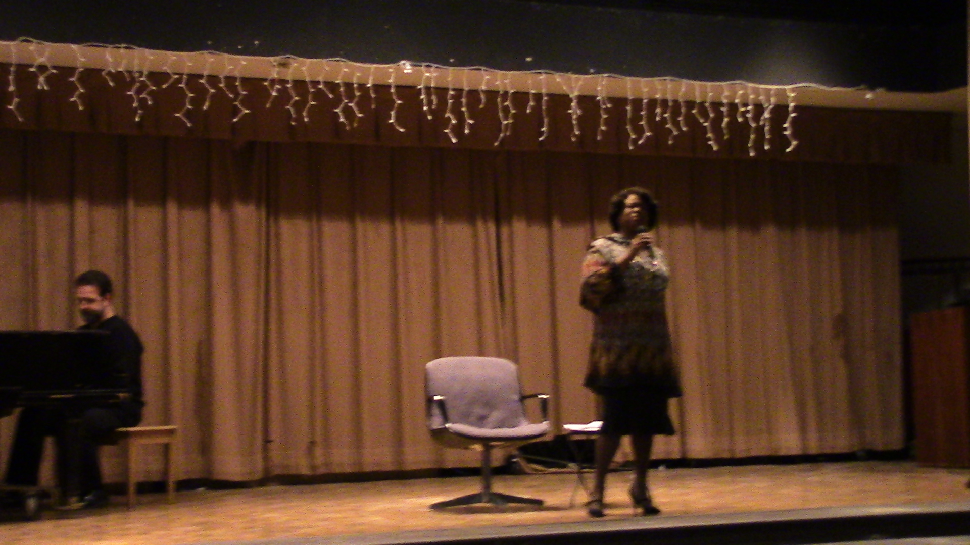 Not the best pics — but the performance by Laura (standing & sitting) was ASTOUNDING. She did six (count ’em, 6) song by Marian, and the script had a few amusing moments. It focused on the denial by the DAR (Daughters of the American Revolution) of Marian’s request to sing at Constitution Hall. It created quite a brou-haha, at the time. And brought all sorts of allies (Eleanor Roosevelt, Walter White, Howard University) to Marian’s side. Marian’s life as a trailblazer was so amazing that, as I told the audience in post-performance comments, “tribute must be paid”. Not surprisingly a few “Amens” accompanied my comment.
