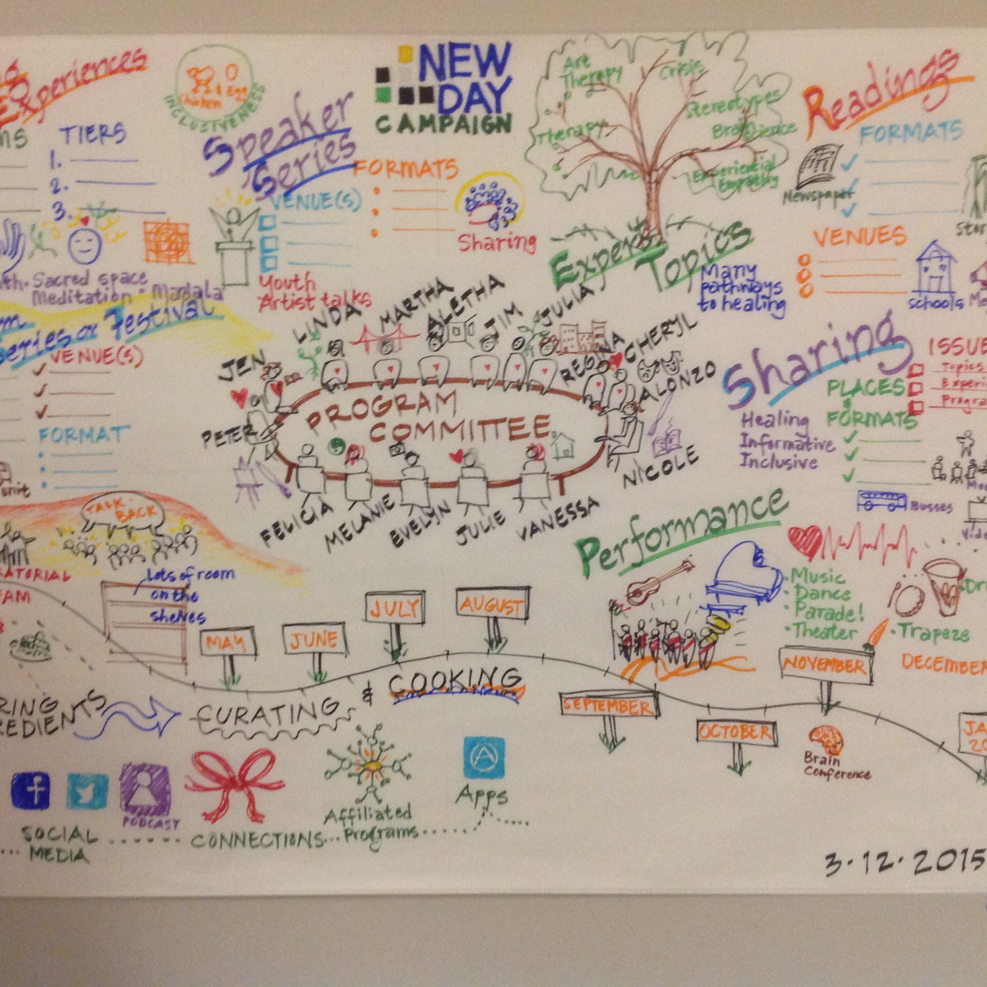 Arts & Healing #2   A couple days later I was a member of the NEW DAY CAMPAIGN planning session, hosted and founded by Peter Bruun. One of Peter’s assistants worked on this drawing, that actually outlines the goals we’re hoping to achieve, during the entire two hour meeting. The campaign breaks down how — starting in the fall — we’re concentrating on Performance/Sharing/Readings/Exhibits/Speakers to bring attention to how the various artistic expressions work to challenge stigma associated with existing behavioral conditions.