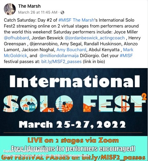 And an extra special thanks to David Hirata, an eclectic performer in his own right, for handling my tech stuff (Zoom always seem to have a surprise or two) and keeping me plugged in. It’s always a delight to perform “B-Side” and I feel privileged to have been chosen for the Festival. The Marsh is allllllllllll the way out yonder in San Francisco and I’m happy my voice got heard. The Marsh is finalizing recordings of all the performances, I think around April 1st they’ll be available. I love the play (natch!) and any opportunity to perform it is a true gift.