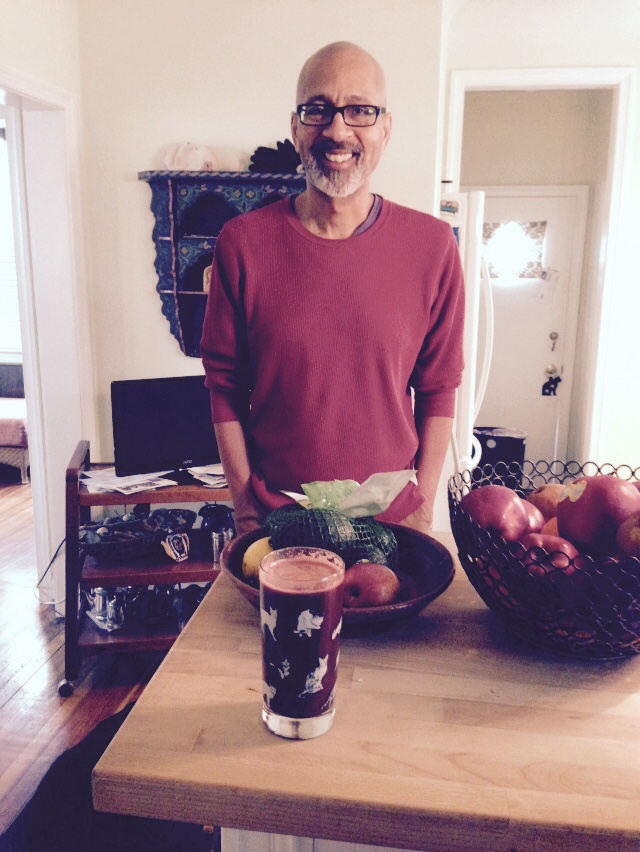 Here’s me in the kitchen about to drink the most beautiful purple colored juice you ever saw. It’s got beets, orange (peel and all), celery, apple, kale and a few other things. It’s too pretty to drink. We only had one beet, but as you know, a little beet goes a long way. Now, the pulp from this juice was absolutely too gorgeous to just compost. “What to do? What to do?”