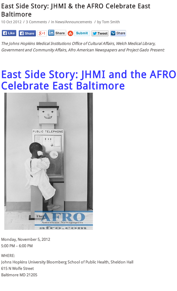 I worked long and hard with a cast of four to make this happen. This is an archival picture at Hopkins Hospital. How can you tell? Do the words “Public Telephone” ring a bell? We decided this would make a nice pic to advertise. It comes from the AFRO, and in essence, this is the nature of the performance. Pictures from the AFRO and short, written stories that I created around the pictures. The entire evening lasted less than an hour. And describing what it was took most of my energy, since they hadn’t had anything like this at Hopkins before. It wasn’t a full play. It wasn’t something the audience was familiar with. But it situated the AFRO and Hopkins in the same conversation. They were both created within a year or two of one another, but are both miles apart, am I right.