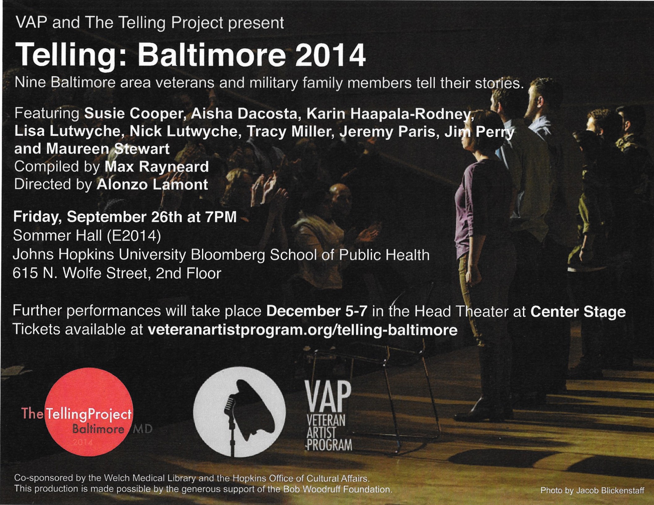 So I recently parted ways with my “Telling: Baltimore” troupe. This is my cast at Center Stage. Damn, they wuz good. We performed excerpts at three schools in Baltimore, and also at a CODE OF SUPPORT event in D.C. at the WW2 Memorial. The cast just got better and better. We started rehearsing back in July, and as time went on I knew this was something special. Not only was it one of the most profound experiences in my life, but I felt like I got much more from them than they realized. They were so open about psychological wounds they’re still dealing with.