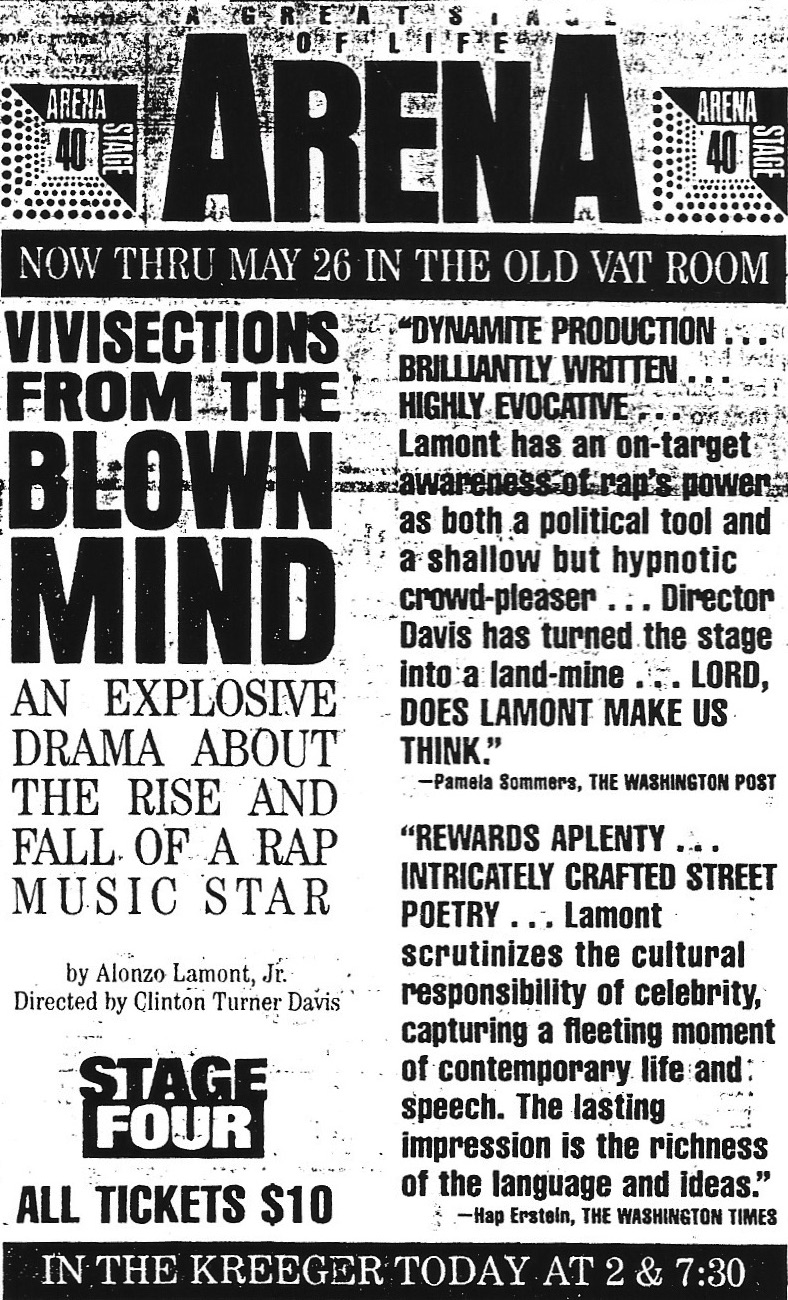 And here’s “Vivisections” in D.C. at Arena Stage. Zelda Fitchlander (I believe it was Zelda, she was Director of Arena) came to tell the cast that (after our MARVELOUS reviews came out) that she hadn’t realized what they had on their hands. They thought they were getting a Rap Musical. Something frothy and trendy to capitalize on the Rap Phenomenon. “Lord, does Lamont make us think”.